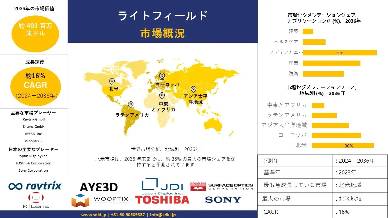 ライトフィールド市場分析では、人間の視覚に近い光と奥行きの知覚を再現する先進的なイメージング技術の採用拡大に焦点を当てています。ライトフィールド技術は、光の強度だけでなくその方向も捉えることで、撮影後のピント調整や臨場感あふれる3Dビジュアル化を可能にします。この革新的技術は、コンシューマーエレクトロニクス、自動車、ヘルスケア、エンターテインメントなど幅広い分野で注目されており、AR/VR(拡張・仮想現実)、自動運転、医療画像処理などの応用を支えています。現実的で高品質なデジタル体験への需要増加と、計算イメージングやAI統合の進展により、市場は急成長しています。
