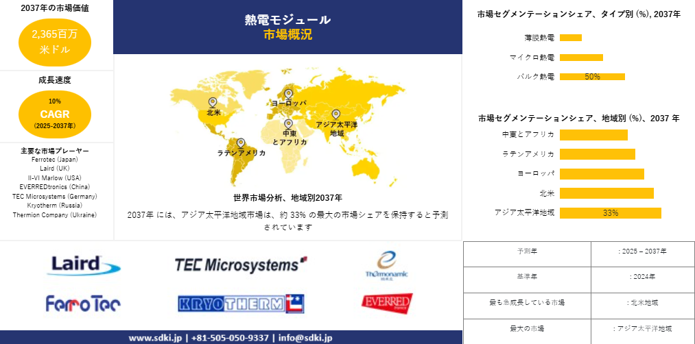 熱電モジュール市場は、技術別(単段および多段)、タイプ別(バルク熱電、マイクロ熱電、および薄膜熱電)、機能別(汎用、深冷)、オファリング別(ハードウェア、サービス)、最終用途別、および地域別に分割されます。これらのセグメントは、さまざまな要因に基づいてさらにサブセグメント化され、各セグメントおよびサブセグメントの複合年間成長率、評価期間の市場価値およびボリュームなど、市場に関するいくつかの追加情報で構成されます。
