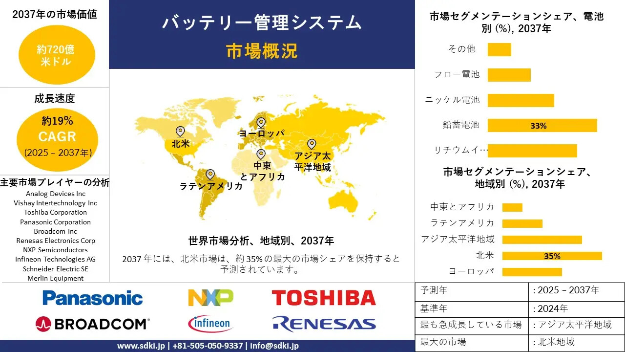 バッテリー管理システム市場の主要なキープレーヤーには、Analog Devices, Inc.、Vishay Intertechnology, Inc.、Toshiba Corporation、Panasonic Corporation、Broadcom Inc.、Renesas Electronics Corporation、NXP Semiconductors、Infineon Technologies AG、Schneider Electric SEなどがあります。この調査には、バッテリー管理システム市場におけるこれらの主要企業の詳細な競合分析、企業プロファイル、最近の動向、および主要な市場戦略が含まれています。