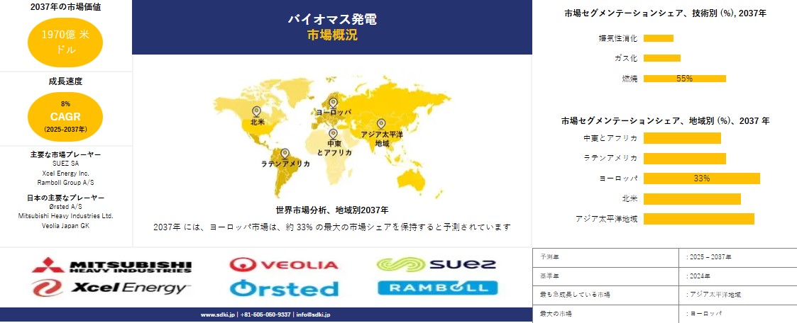 バイオマス発電産業の概要と競争環境は、再生可能で持続可能なエネルギー源への世界的な移行によって急速に成長している分野を示しています。バイオマス発電は、農業残渣、森林副産物、都市廃棄物などの有機資源を活用しながら二酸化炭素排出量を削減できる有効な解決策として注目されています。政府による再生可能エネルギー促進政策や導入補助金制度、さらに発電効率を高める技術革新が市場の拡大を後押ししています。一方で、原料供給の不安定さ、輸送コストや供給網の課題、初期投資の高さなどの要因が依然として導入の障壁となっています。競争環境においては、Veolia、Drax Group、Babcock & Wilcox、三菱重工業、Ørstedといった主要企業が、戦略的提携、設備拡張、技術革新を通じて市場競争力を強化しています。