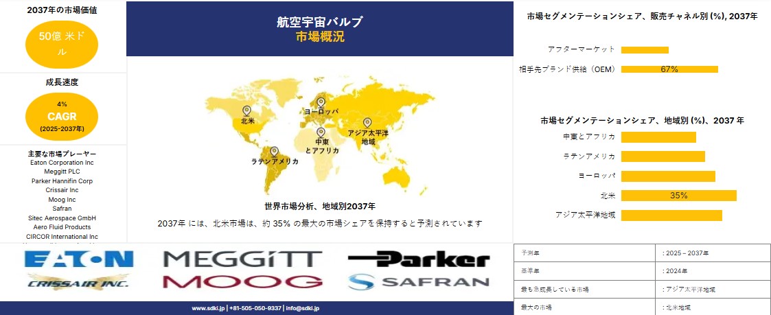 **航空宇宙バルブ市場**規模の地域別概要では、主要地域ごとの成長動向と採用状況に明確な差があることが示されています。北米は、航空機メーカーの集積、先進的な航空宇宙インフラ、防衛航空への高い投資により、市場を牽引しています。特に米国は、商用機および軍用機の継続的な更新により、市場規模を大きく押し上げています。欧州は、ドイツ、フランス、英国などにおける航空宇宙産業の強さと、軽量化・省エネ型バルブ技術の革新が市場成長を支え、世界で2番目の市場規模を有しています。一方、アジア太平洋地域は最も急速に拡大しており、航空需要の増加、国内航空会社の拡大、中国・インド・日本での航空機生産の増加が成長を後押ししています。中南米および中東・アフリカ地域でも、空港インフラの近代化や防衛予算の増加により、徐々に市場が拡大しています。SDKI Analyticsによると、今後の市場成長は、技術革新、航空機の近代化、そして世界的な航空機製造能力の拡大によって引き続き左右される見通しです。