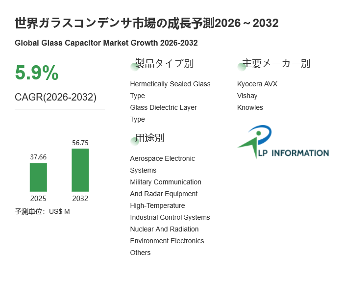 2026年3月,LP Information, Inc.(LPI)の最新調査レポート「世界ガラスコンデンサ市場の成長予測2026~2032」は、過去の販売実績に基づいて2024年の世界全体のガラスコンデンサ販売状況を分析し、地域別及び市場セクター別に2025年から2032年までの販売予測を提供しています。同レポートは、地域、市場セクター、サブセクター別に分類されたガラスコンデンサの売上を百万米ドル単位で詳細に分析しています。