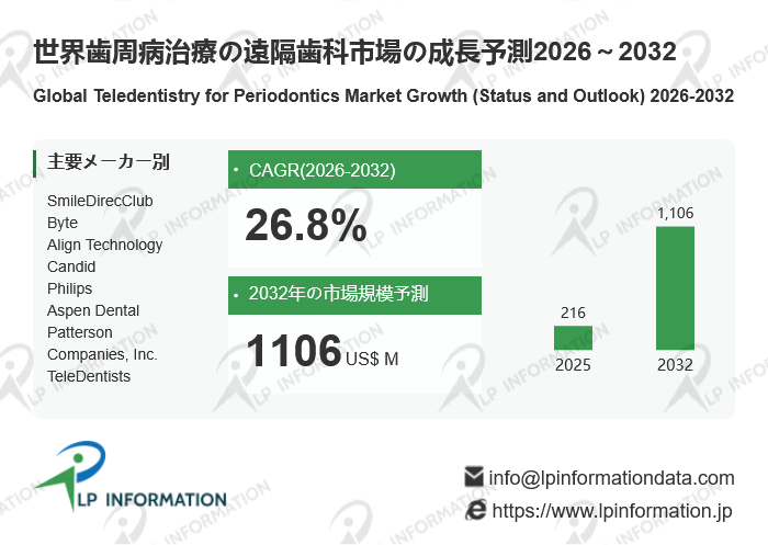 2026年3月,LP Information, Inc.(LPI)の最新調査レポート「世界歯周病治療の遠隔歯科市場の成長予測2026~2032」は、過去の販売実績に基づいて2024年の世界全体の歯周病治療の遠隔歯科販売状況を分析し、地域別及び市場セクター別に2025年から2032年までの販売予測を提供しています。同レポートは、地域、市場セクター、サブセクター別に分類された歯周病治療の遠隔歯科の売上を百万米ドル単位で詳細に分析しています。