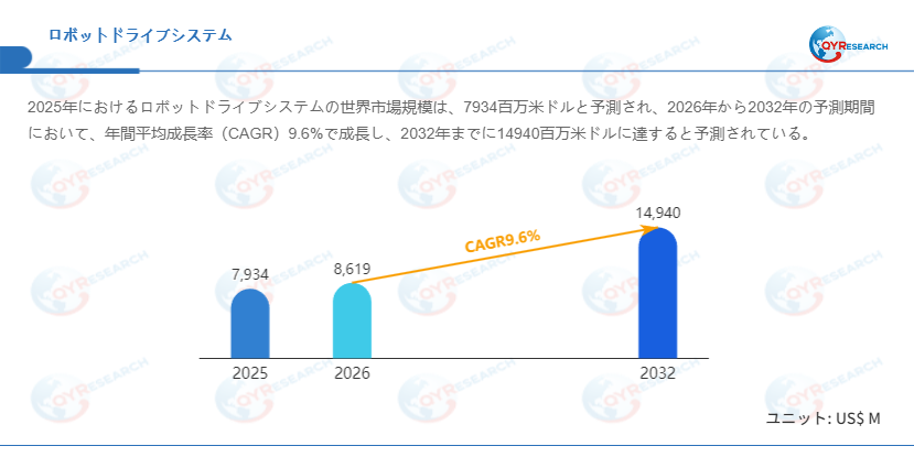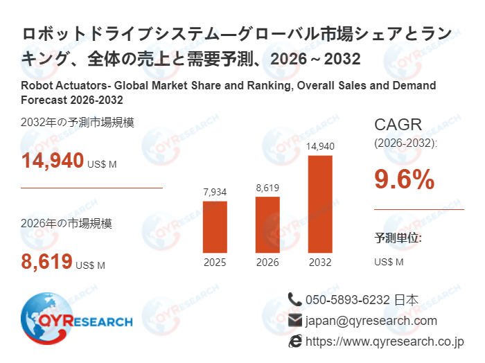 QYResearchが発表した新たな市場調査レポート「ロボットドライブシステム―グローバル市場シェアとランキング、全体の売上と需要予測、2026~2032」によると、世界のロボットドライブシステム市場規模は2025年の約7934百万米ドルから2026年の8619百万米ドルへと順調に拡大すると見込まれ、予測期間中は年平均成長率(CAGR)9.6%で成長し、2032年には14940百万米ドルに達すると予測されている。
