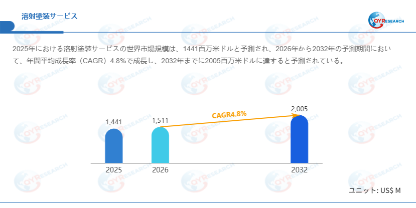 QYResearchが発表した新たな市場調査レポート「溶射塗装サービス―グローバル市場シェアとランキング、全体の売上と需要予測、2026~2032」によると、世界の溶射塗装サービス市場規模は2025年の約1441百万米ドルから2026年の1511百万米ドルへと順調に拡大すると見込まれ、予測期間中は年平均成長率(CAGR)4.8%で成長し、2032年には2005百万米ドルに達すると予測されている。
